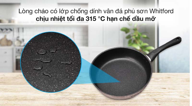 Bề mặt lòng chảo có lớp chống dính vân đá phủ sơn Whitford chịu được mức nhiệt tối đa 315°C