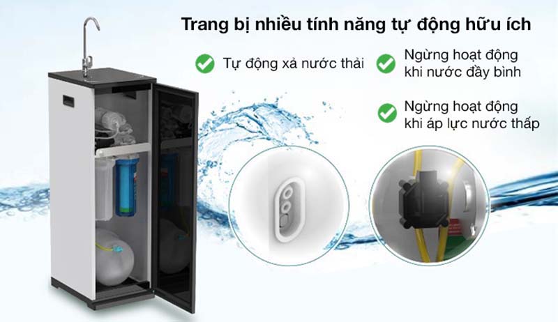 | Đặc điểm khác | - Tự động ngừng khi áp lực nước đầu vào quá thấp - Tự động ngắt khi nước đầy bình |