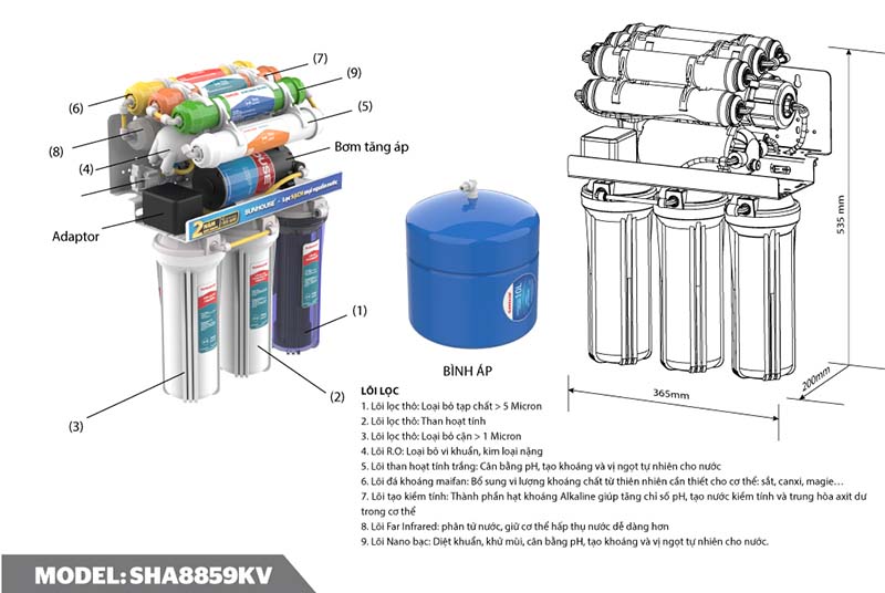 Máy lọc nước SHA8859KV sở hữu bộ lọc 9 lõi, không chỉ lọc sạch nước mà còn bổ sung các khoáng chất hữu ích cho cơ thể. Sản phẩm gồm 3 cấp lọc chính bao gồm lọc thô, lọc tinh và bù khoáng.