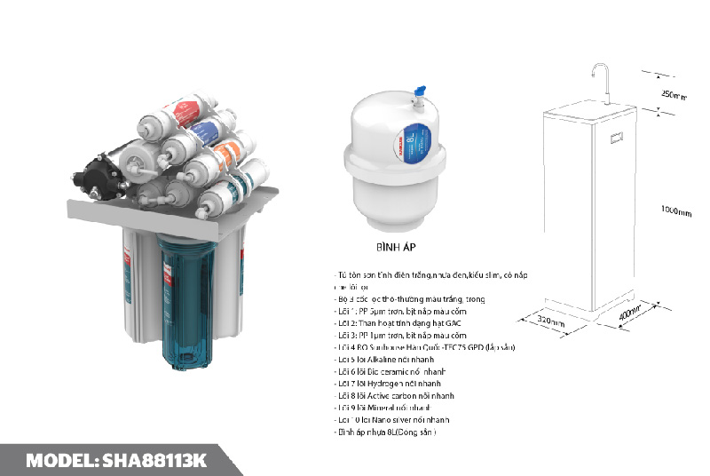 Máy lọc nước SHA88113K sở hữu bộ lọc 10 lõi, không chỉ lọc sạch nước mà còn bổ sung các khoáng chất hữu ích cho cơ thể. Sản phẩm gồm 3 cấp lọc chính bao gồm lọc thô, lọc tinh và bù khoáng.