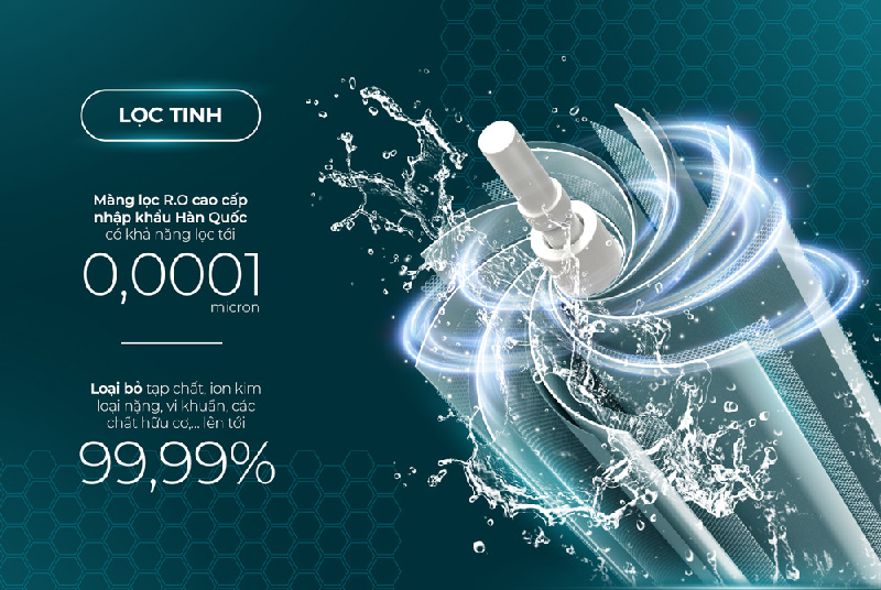 - Màng lọc R.O cao cấp nhập khẩu Hàn Quốc, lọc tới 0,0001 micron, loại bỏ 99.99% tác nhân gây hại