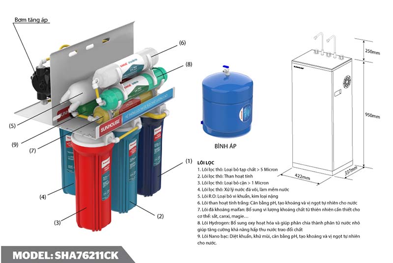 Máy lọc nước R.O nóng lạnh 9 lõi SUNHOUSE SHA76211CK