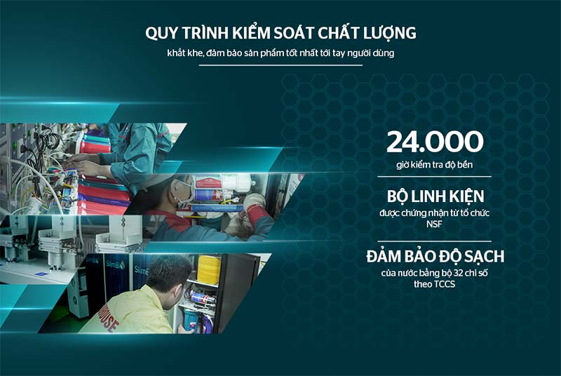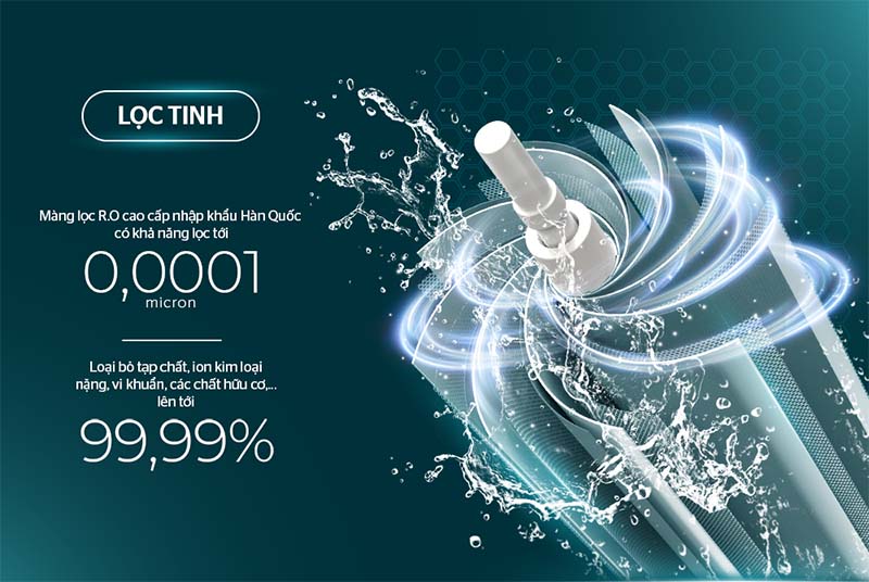 - Màng lọc R.O cao cấp nhập khẩu Hàn Quốc, lọc tới 0,0001 micron, loại bỏ 99.99% tác nhân gây hại