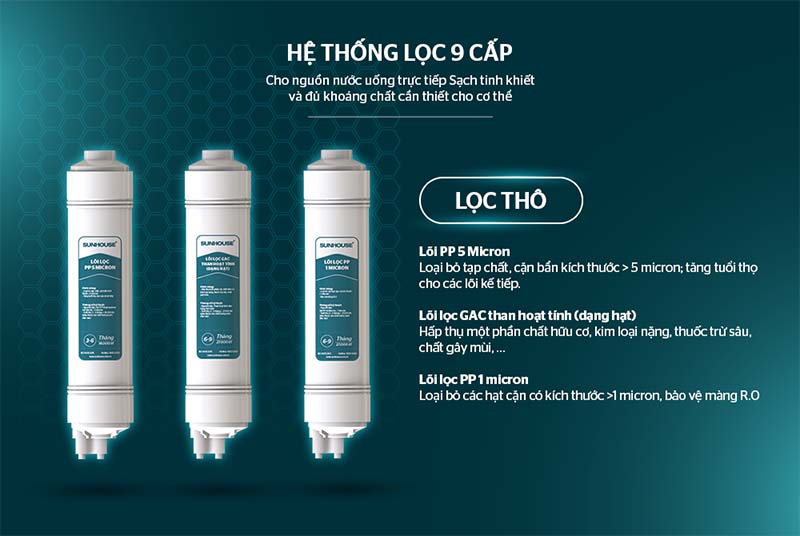 - Hệ thống lõi lọc 9 cấp, lọc sạch mọi tạp chất, tạo nguồn nước sạch tinh khiết