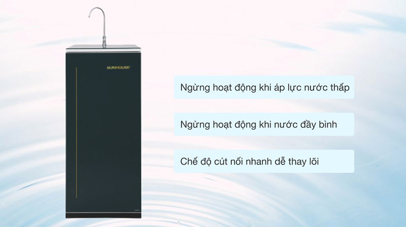 SUNHOUSE SHA88116K được tích hợp nhiều tính năng tự động hiện đại như tự ngắt khi áp lực nước đầu vào quá thấp, tự động ngắt khi nước đầy bình và tự xả nước thải, giúp tiết kiệm điện nước, kéo dài tuổi thọ máy và đảm bảo an toàn trong suốt quá trình sử dụng.