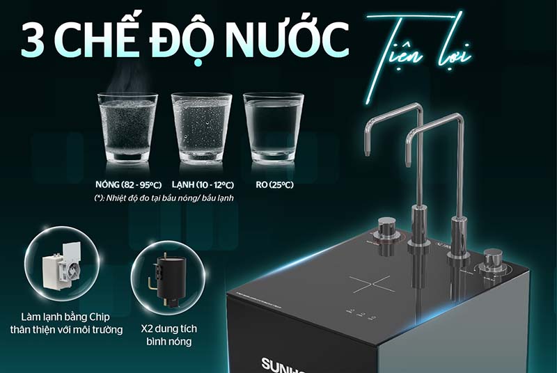 - 3 chế độ nước tiện lợi: Nóng - Lạnh - RO