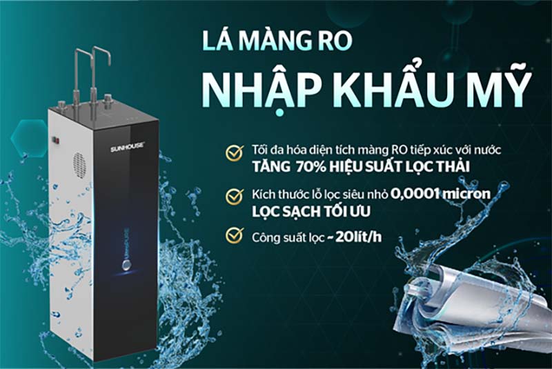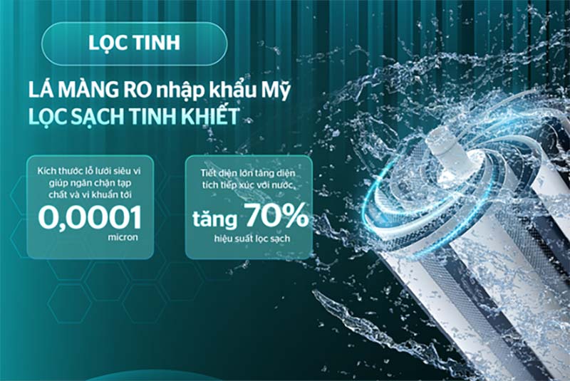- Màng lọc thẩm thấu ngược RO cao cấp với lá màng được nhập khẩu từ Mỹ, có tác dụng loại bỏ hoàn toàn tạp chất, ion kim loại nặng, các chất hữu cơ, amip, asen, vi khuẩn tới 0,0001 mircon…