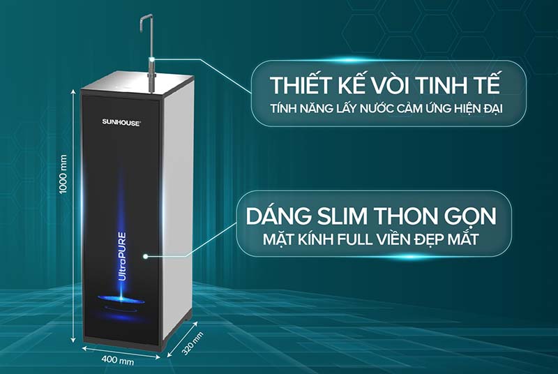 Máy lọc nước RO UltraPURE SUNHOUSE 10 lõi SHA8815K được thiết kế mặt kính full viền đẹp mắt, kiểu dáng slim gọn gàng tiết kiệm hơn 15% diện tích, phù hợp với mọi không gian phòng khách, phòng bếp hay cả văn phòng.