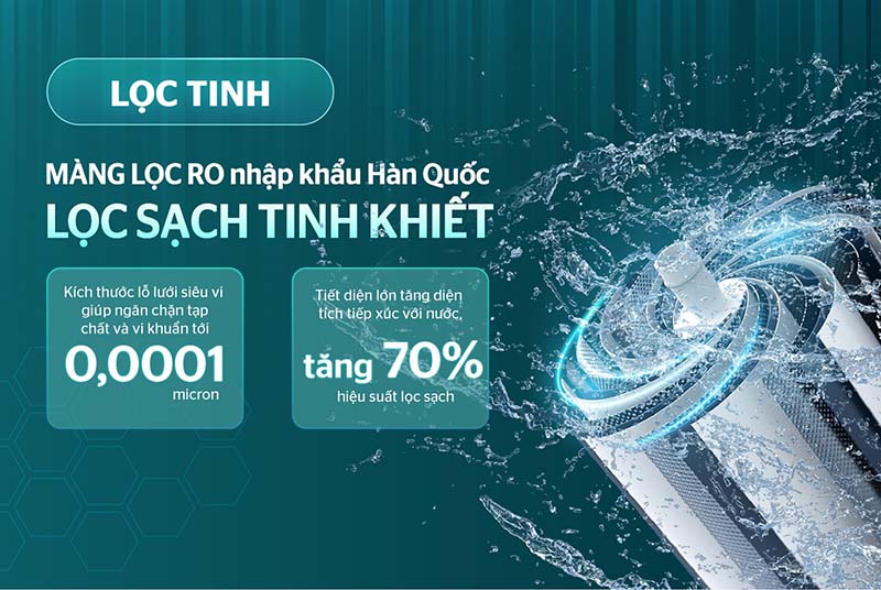 - Màng lọc thẩm thấu ngược RO cao cấp nhập khẩu Hàn Quốc, có tác dụng loại bỏ hoàn toàn tạp chất, ion kim loại nặng, các chất hữu cơ, amip, asen, vi khuẩn tới 0,0001 mircon…