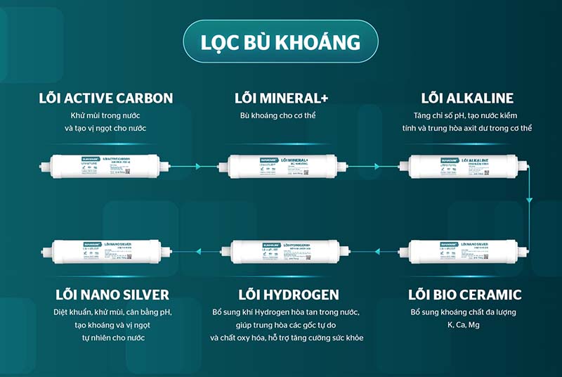 - Lõi diệt khuẩn Nano Silver: Diệt khuẩn, khử mùi, cân bằng pH, tạo khoáng và vị ngọt tự nhiên cho nước.