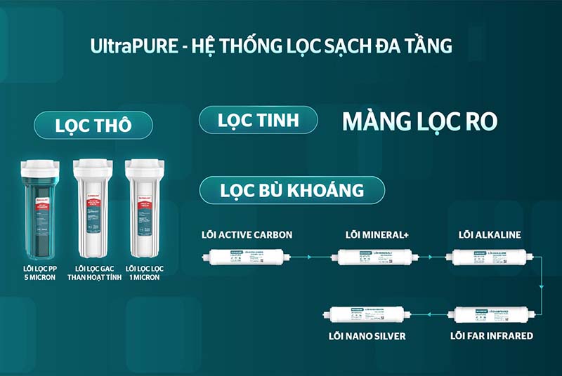 Công nghệ UltraPURE bù khoáng với 5 lõi lọc đủ các công năng khác nhau, giúp cung cấp vừa đủ lượng vi khoáng cần thiết cho cơ thể và tạo vị ngọt tự nhiên cho nước.