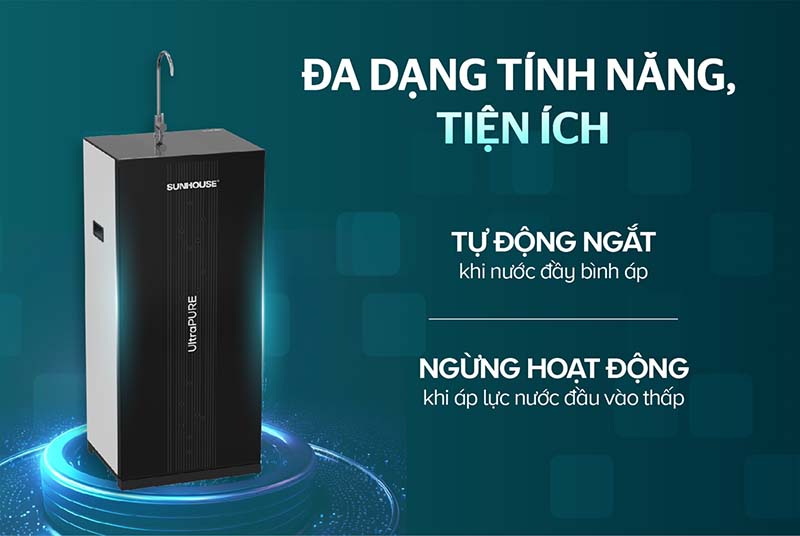 Máy lọc nước RO UltraPURE SUNHOUSE 9 lõi SHA8691K khả năng tự động ngắt khi nước đầy bình áp, ngừng hoạt động khi áp suất nước đầu vào thấp, tự động xả nước thải ra bên ngoài. Sản phẩm được bảo hành 1 năm trên toàn quốc đối với linh kiện điện.
