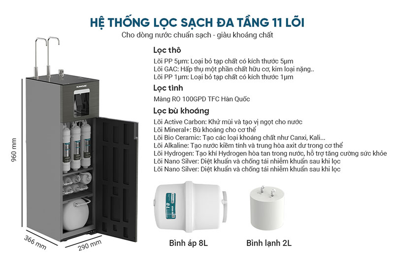 ♦ Hệ lọc 11 lõi đa tầng, màng RO Hàn Quốc, bổ sung khoáng chất