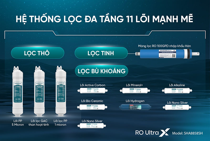 MÁY LỌC NƯỚC RO UltraX SUNHOUSE 11 LÕI SHA8858SH – GẤP ĐÔI HYDROGEN, VƯỢT CHUẨN NƯỚC UỐNG SẠCH